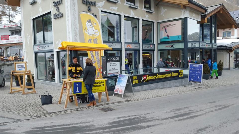 Direkt am Dorfeingang bei der Brücke/Drogerie im El Rico-Gebäude.Promotion-Stand vor dem Sportgeschäft ZEGG Sport & Mode.